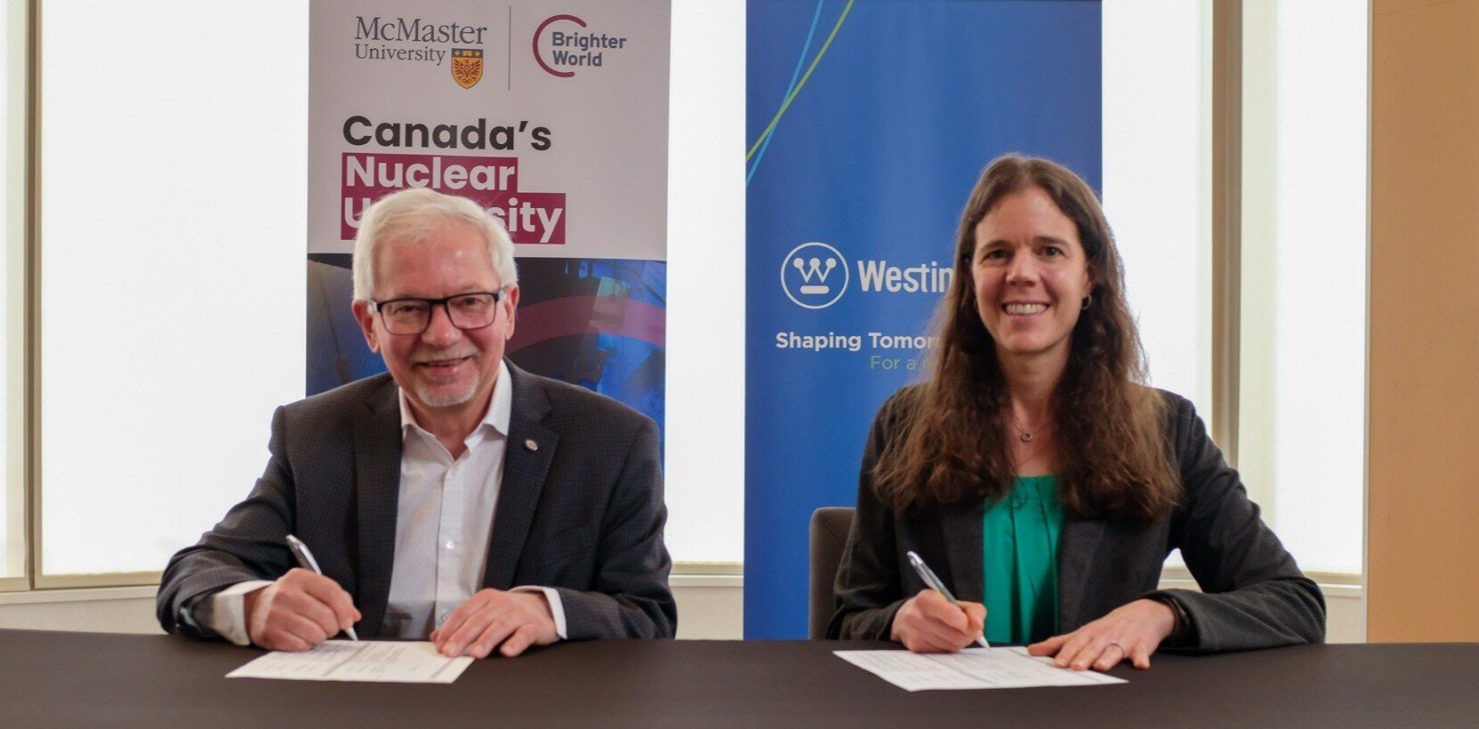 Photo caption: Dr. John Preston of McMaster University and Westinghouse Vice President Leah Crider sign the MoU for collaboration on the eVinci technology.